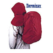フードとザックカバーが一体になっているため、背中や肩口からの雨の侵入を防ぎます。またフード部分には防水透湿素材ダーミザクスを使用して、蒸れを少なくしています。ザックカバー部分は軽量な30Dナイロンリップストップ・カラーコートです。 |