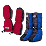シューズの上部分とミトンの下部分にはほとんどダウンは入っていません。ゴアテックスとダウンプルーフの2重構造です。 |