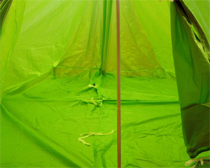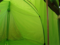 ツェルトインナーフレームをツェルト内の差込口に差し込んで3箇所のヒモで固定します。インナーフレームを使用することでツェルト内の居住性は格段にアップします。