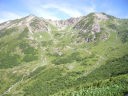 下りきれば、歩きやすいハイマツと石の多いルートを下ります。