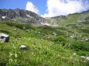 途中雪渓を渡ります。滑りやすいので注意してください。それからはしばらくガレのルートを進みます。