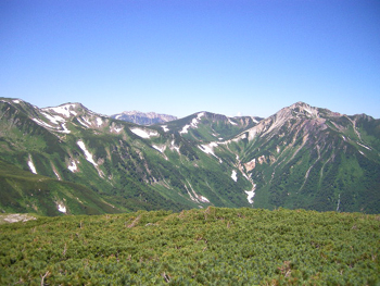 水晶岳山頂です。ここからはやはり針の木・燕岳方面にさえぎるものがなく、雄大でおだやかな表情に感動するでしょう。ゆっくり満喫してください。